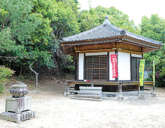 石段を上がり山門の下で傘をたたむ。振り返ると眼前には向島、その東には江泊山の尖峰と大平山の山容が美しい。