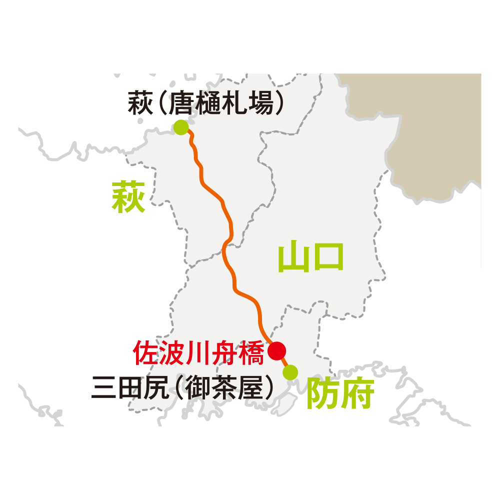 佐波川に架かる舟橋を思い浮かべると「箱根八里は馬でも越すが、越すに越されぬ大井川」という言葉を思い出してしまう。洪水ともなれば足止めを喰らって難儀する川越え。萩往還を歩く際に渡る唯一の一級河川・佐波川はこのように舟を並べ、その上に板を張って渡っていた。何度も洪水で流されたためこのような方式が採られたのだが、洪水となる前に舟は陸揚げされたから、当然大井川同様に通行止めとなった。