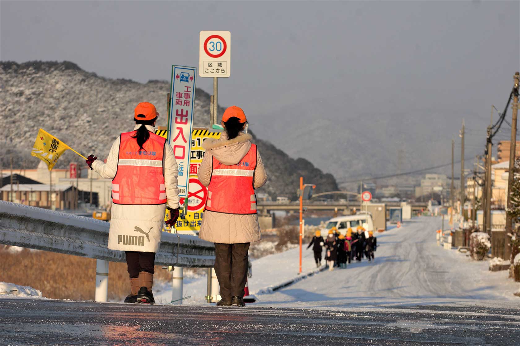 寒い朝、大内っ子たちが通学するのを交通立哨して見守る「まもり隊」の皆さん。頭が下がるし、子供たちには頑張れと声援を送りたくなる。