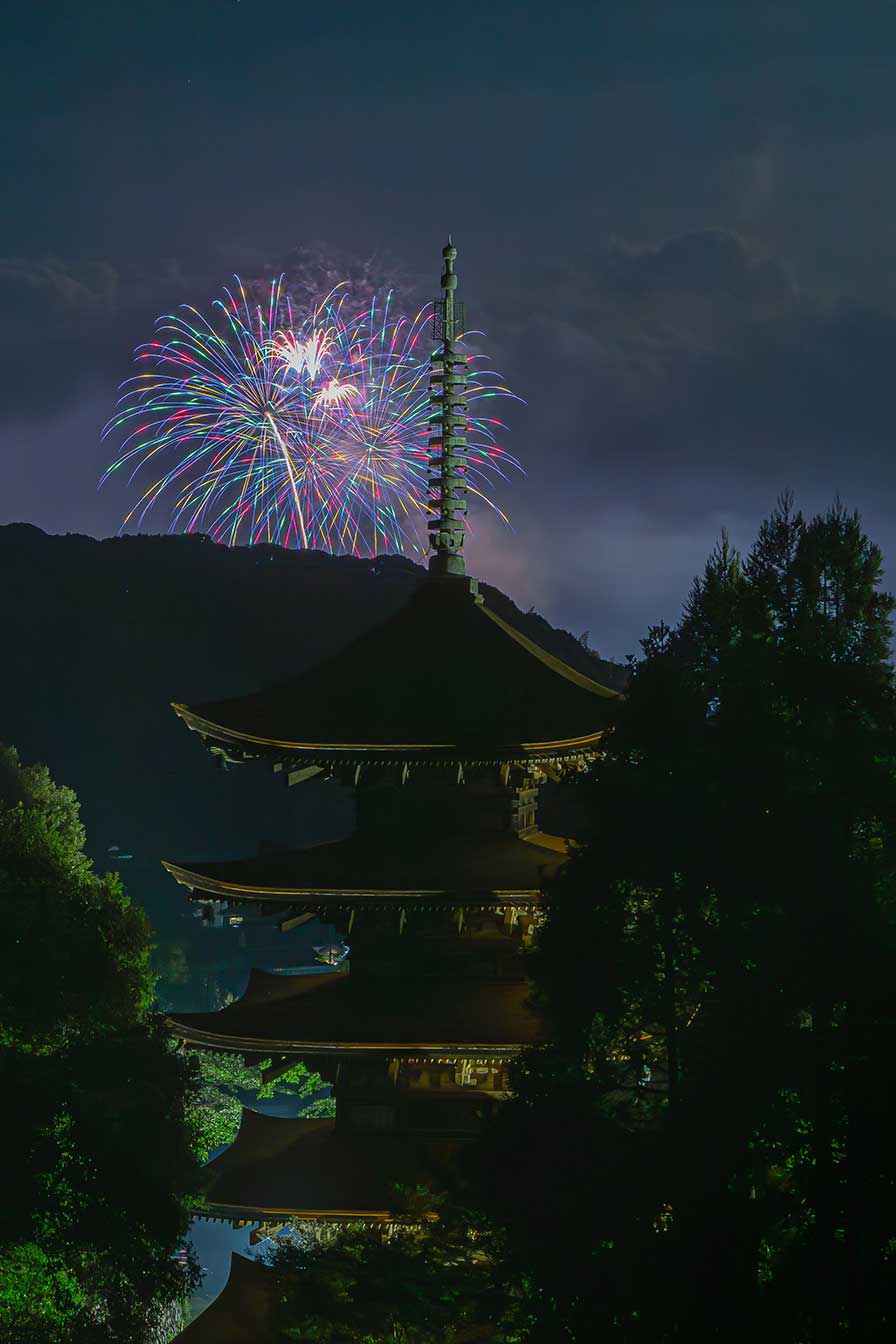 山口駐屯地の夏祭り花火を瑠璃光寺と絡めて撮りました。
