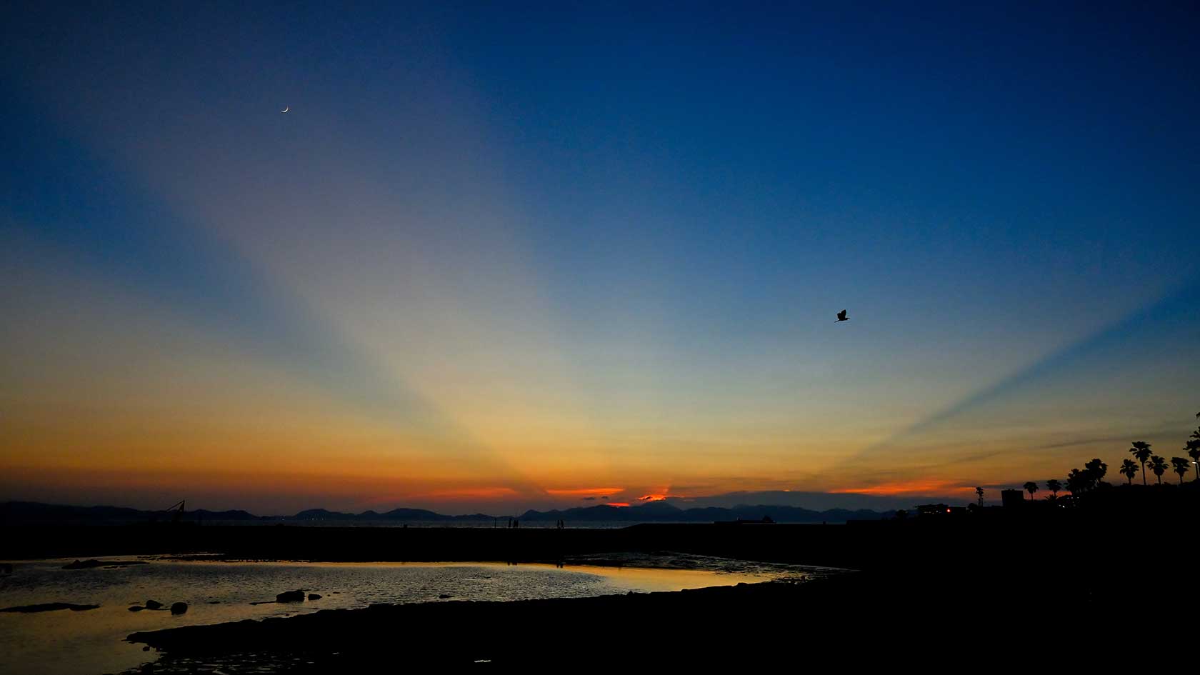 雲を抜ける光芒の道を、一羽の鳥が横切る。月と太陽の余韻が同居する焼野の空で、偶然の瞬間をとらえました。