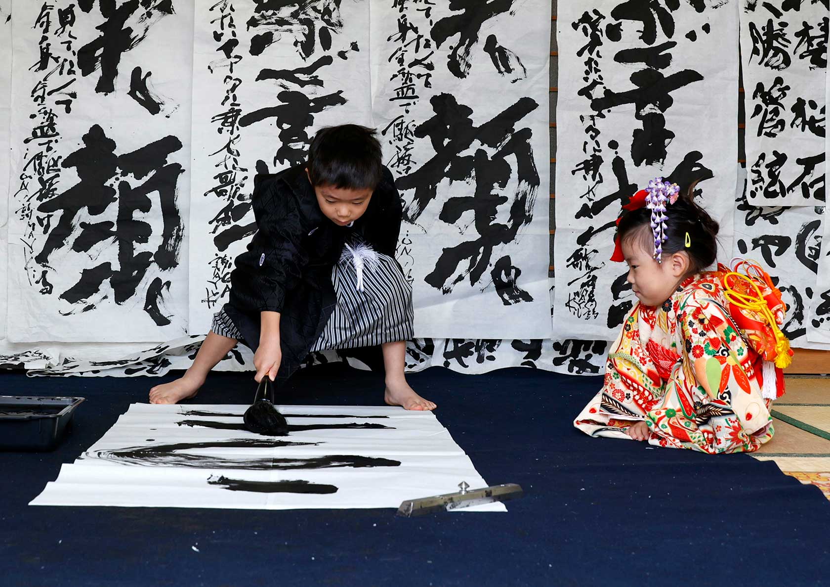朝日が七五三のイベントで書初めに挑戦しました。新年用にと初めて持つ大きな筆で、うまと真剣に書きました。